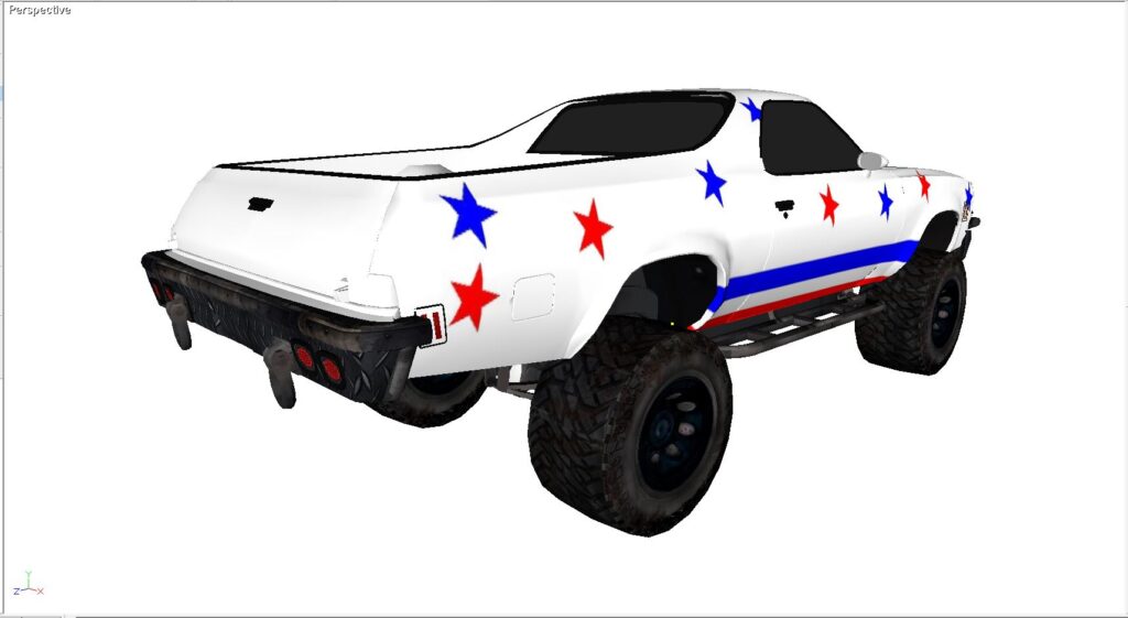 I liked the way the stock El Camino looked but I wanted to build a model that combined the El Camino bodylines and features I liked. I also wanted to build custom diamond plate and tube bumpers for it. The 3D model has a Chevy S10 frame @ 117 inches, the El Camino body needed 116. The frame was sectioned just as it would have to be and the arches relocated, at the same time I lost that inch. It surprised me how faithfully it recreated itself as I worked with, first building the model and then grafting in the S10 frame and full-size axels from a full-size chevy truck along with leaf spring suspension front and rear. The tires are 33-1450, larger and taller than the example.
