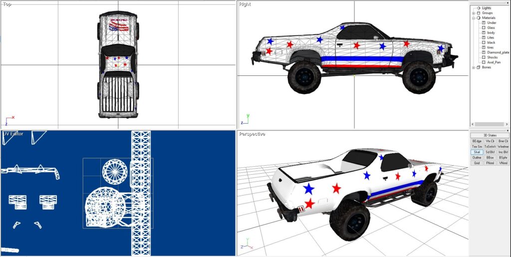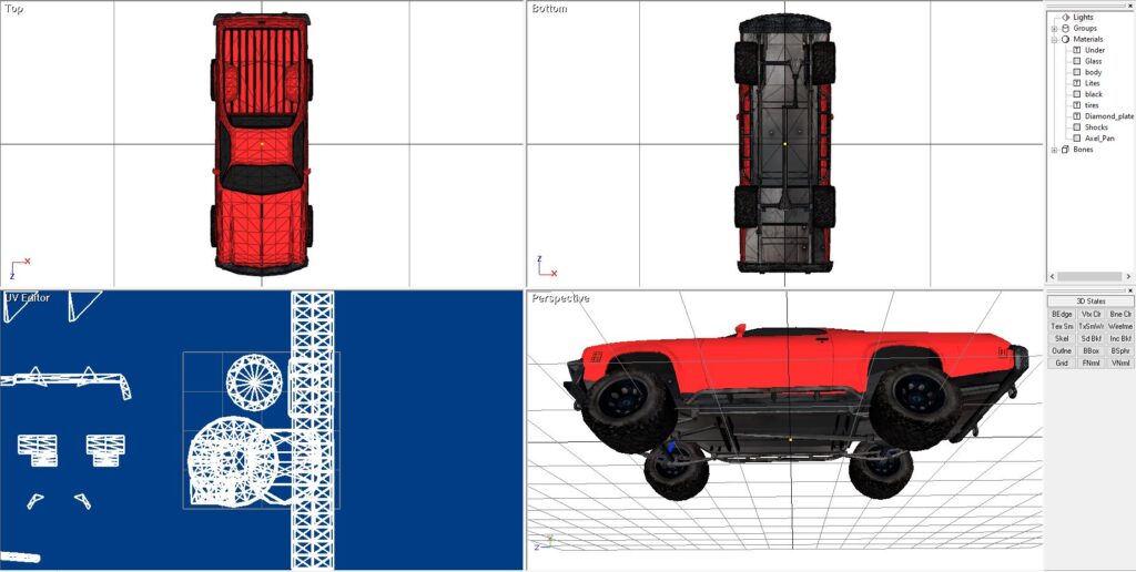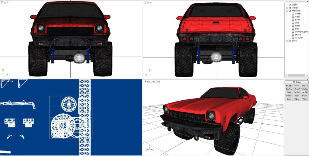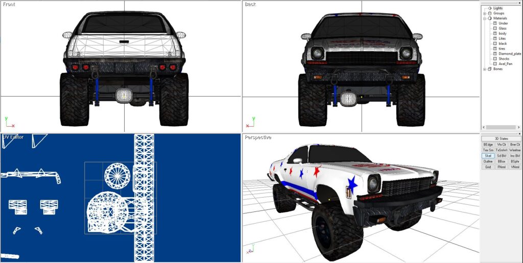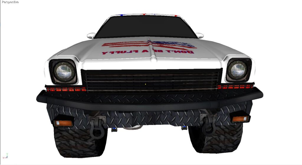 I liked the round headlights from my 1986 Chevy Malibu, and the front grill, so that is what I used. But I liked the olde 1972 bodyline, so I used that. And, of course, why not full-blown 4×4 capabilities too.